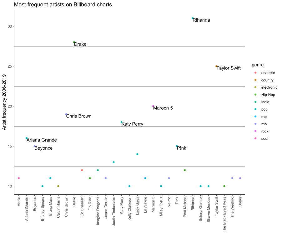 Plot 1. All the artists with 10 or more songs on the Billboard charts throughout 2006 – 2019.