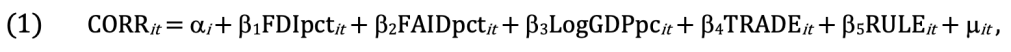 where a is the fixed effect intercept unique to a country, beta are the common slope coefficients, i and t represent a country and a year respectively, and μ is the error term. CORR is either of the corruption perception indexes, FDIpct is FDI as a percentage of GDP, FAIDpct is the percentage of foreign aid as a percentage of GDP, LogGDPpc is the natural logarithm of GDP (PPP) per capita, TRADE is trade openness and RULE is rule of law.