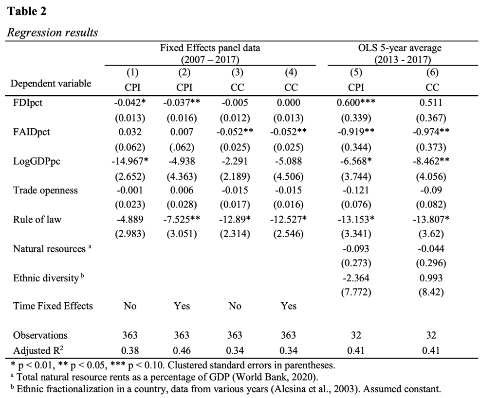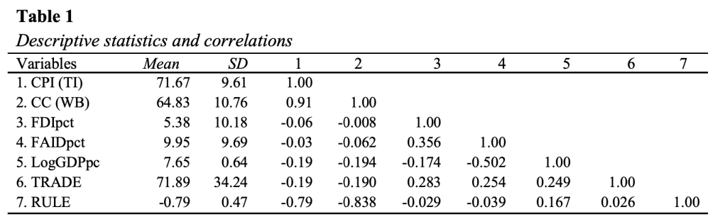 The mean, standard deviation, and correlations between variables are provided in Table 1. The high positive correlation between the two corruption perception indexes suggests that perceptions are somewhat similar and might be in the ballpark of actual corruption. Rule of law seems to have high explanatory power as it highly correlates with dependent variables. LogGDPpc is somewhat correlated with FDI and foreign aid which was expected.